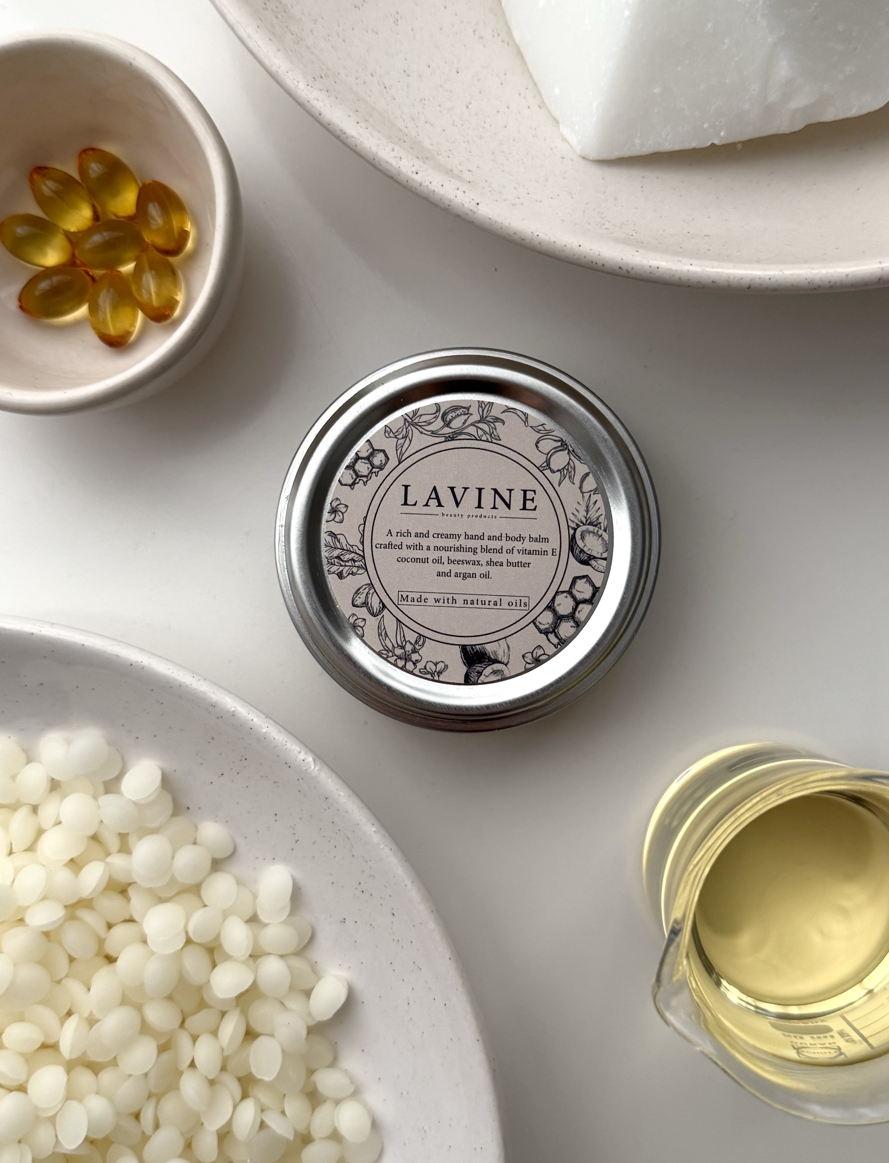 بالم دست و بدن لاوین ترکیبی از مواد طبیعی،که شامل ویتامین E، شی باتر، روغن نارگیل، موم زنبور و روغن ارگان هست.